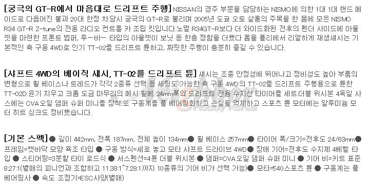 * 주행을 위해서는 별매로 조종기세트, 전자변속기, 7.2V배터리, 충전기, PS 스프레이, AA 1.5V 배터리*2 Set * 4 Set가 필요합니다. |